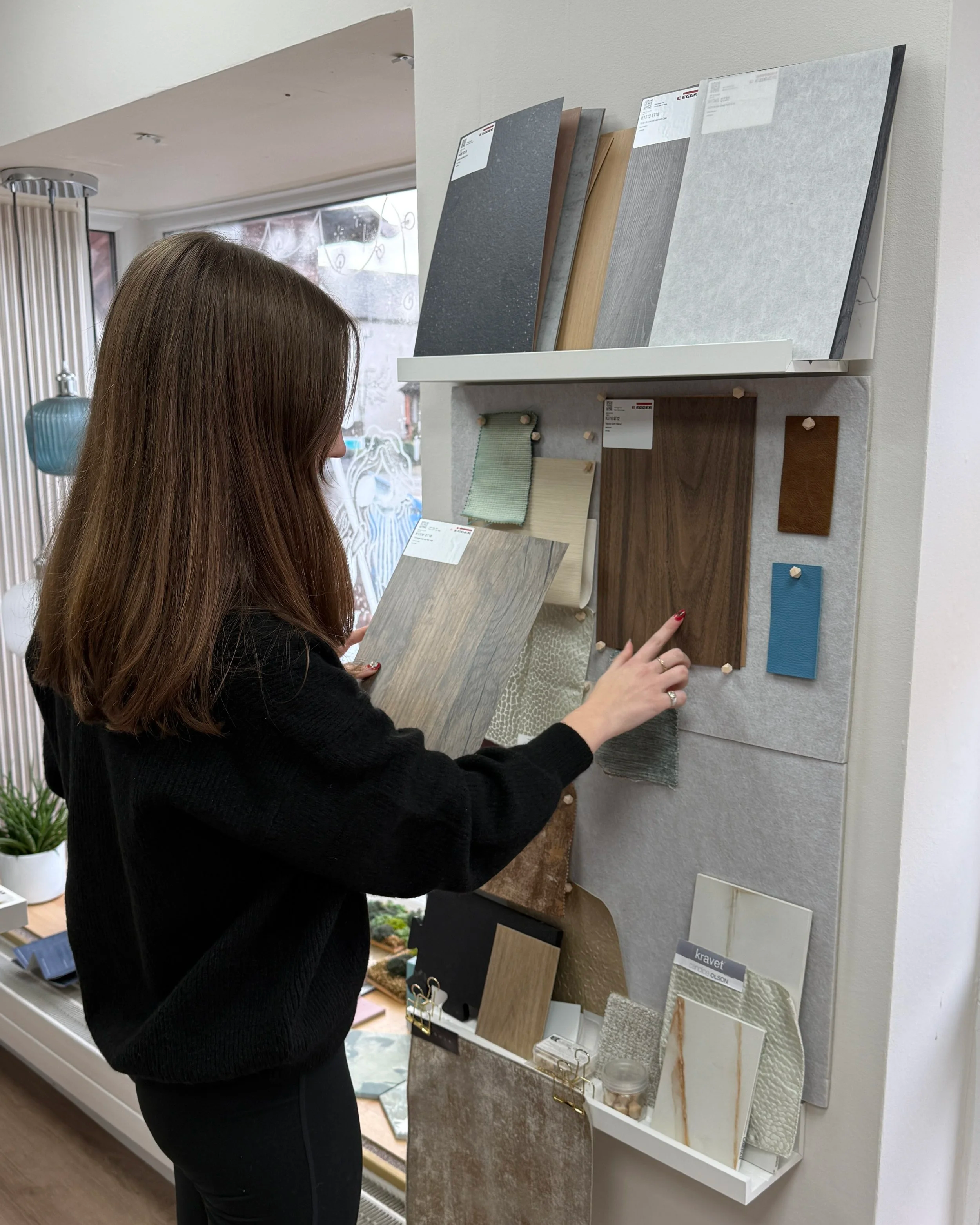 Inside the studio, you’ll find a curated selection of materials, finishes, textiles, and furniture options that reflect the quality and detail of our commercial work. It’s a calm, tactile environment created for clarity and creativity.